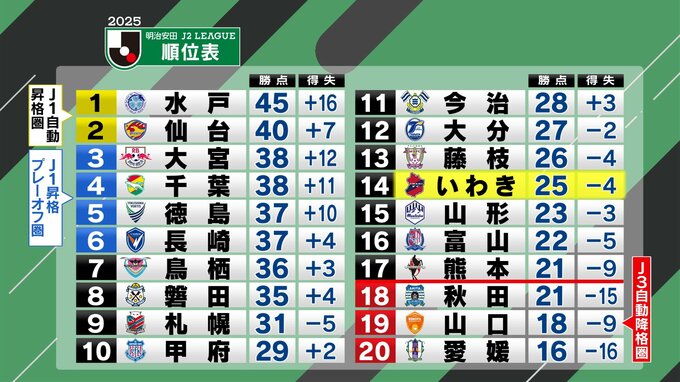 いわきの順位は、変わらず14位のまま、J3降格圏内の18位との勝ち点差は4です。谷村の移籍後、その穴を埋められるのかがカギを握ります。