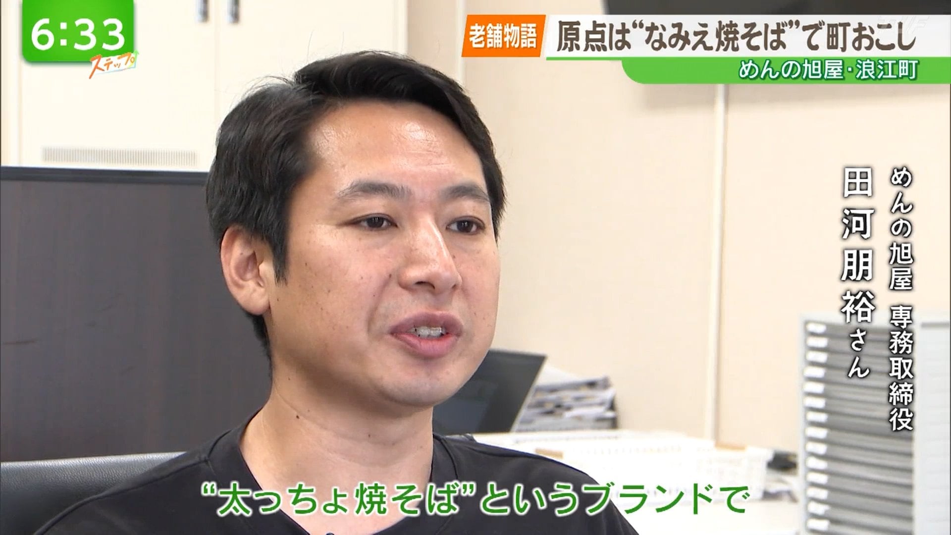 --田河朋裕さん(めんの旭屋 専務取締役)「“太っちょ焼そば”というブランドで焼そばを販売し始めました。その後、浪江町の極太麺で町おこしをしようということで“なみえ焼そば”というブランドが立ち上がりまして。」