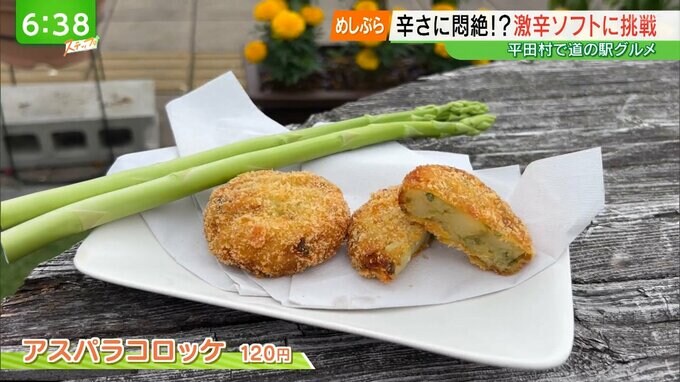 --佐藤アナ「ここに来たらまず食べたいのがこれ!アスパラコロッケですよ、ねいただきます!ん!食べ進めていくと、中にごろっとしたアスパラも入っているので食べ応えあります。一応ソースがついてくるんですけど、つけなくてもいいくらい味がしっかりしていますし、アスパラの美味しさがそのまま感じられます。」