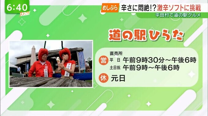 日本一辛い村をうたう平田村。道の駅に入ると、激辛商品がお出迎えしてくれます。また、この時期はモモや村特産のアスパラなど県産品も並んでいますよ!