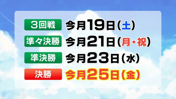 これに伴い、3回戦以降の日程が1日ずつ後ろ倒しとなり、決勝は7月25日(金)に行われる予定です。