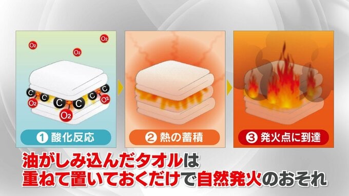 乾燥機の中に限らず、暑い時期は油がしみ込んだタオルを重ねて置いておくだけで自然発火する恐れがあるので注意が必要です。