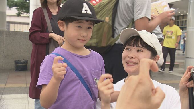 最終日の12日は、JR福島駅前でイベントを行い、子どもたちが手話を体験したり、指文字のハンコで自分の名前を覚えたりして、耳が聞こえない・聞こえにくい人への理解を深めました。