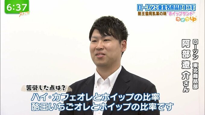 --阿部遼介さん(ローソン 東北商品部)「ハイ・カフェオレとホイップのその比率、そしていちごオレとホイップの比率です。それぞれの比率を上げたとしても、ホイップの良さがなくなってしまう。逆にすると酪王さんの良さがなくなってしまうというところで、比率を見つけるのがとても難しいなと思っていたのですが、酪王さんにも実際にアドバイスをいただきまして、とてもおいしい一品に仕上がったかなと思っております。」