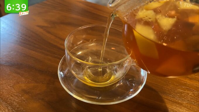 --平岡アナ「いい香りがします。ティーポッドの中にフルーツがそのままたっぷり入っているので、フルーツの旨味が凝縮した紅茶になっています。最高に幸せなひと時です」