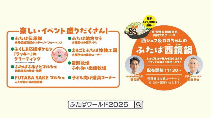 会場では、50以上のブースが並ぶ「ふたばふるさとマルシェ」を開催し、地元グルメや特産品が勢ぞろい。また、お笑いショーや地元伝統芸能の披露、そして、子ども向けの楽しい企画もいっぱいです。司会は、TUFの佐藤玲奈アナウンサーとKFBの鍜治谷琴音アナウンサーが務めます。