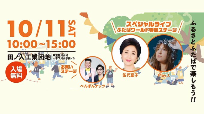 「ふたばワールド」は、ほかにもイベントがもりだくさんです。メインステージで行われるスペシャルライブには、演歌界の大御所、伍代夏子さん。そして、力強い歌声で人気の実力派シンガー、May J.さんが登場。