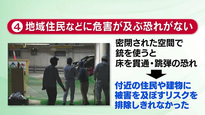 また、4つ目の条件「安全性の確保」については、今回クマが逃げ込んだ立体駐車場のような密閉された空間で銃を使うと弾丸が床を貫通したり、壁に当たって跳ね返ったりして、付近の住民や建物に被害を及ぼすリスクを排除しきれなかったということです。