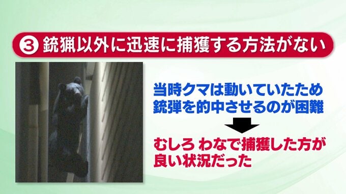 特に、3つ目の「銃猟以外の方法では、的確かつ迅速な捕獲が困難であること」については、当時クマは動いていたため銃弾を的中させるのが難しく、むしろ、わなで捕獲したほうが良い状況だったということです。