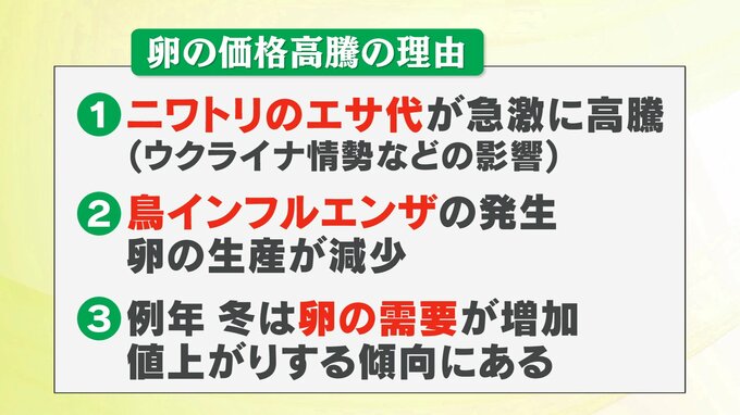 3つ目が冬は卵の需要が増加して例年、この時期は値上がりする傾向にあること。