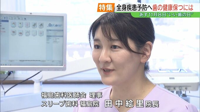 福島歯科医師会理事で、スリープ歯科福島院の田中絵里院長は、普段の口内ケアが全身疾患の予防にもつながると話します。