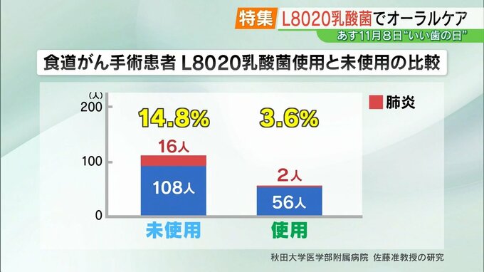 佐藤准教授は、今年、京都で行われた学会で研究の成果を発表しました。研究は、食道がん手術を受けた患者のうち、手術前にL8020乳酸菌が入ったオーラルケア商品を「使用した人」と、「使用していない人」のその後の症状を比較したもの。まだ研究の途中で母数が異なるため、単純比較はできませんが、これまでは、L8020乳酸菌製品を使用していなかった患者108人のうち、14.8%が手術後に肺炎になっていました。一方、製品を使用した56人の患者は、手術後、肺炎を患った割合が3.6%に留まったといいます。
