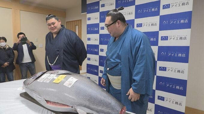 茨城県阿見町の大相撲・二所ノ関部屋では5日、マグロとちゃんこの振る舞い会が行われました。これは住宅メーカーの「アイ工務店」が、初場所の応援として、縁起物の初競りのマグロを部屋に贈ったものです。