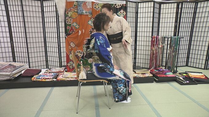 齋藤眞理さん「先にバッグを背もたれに置き、袖を2枚重ねて、浅めに腰をかけます。深く腰かけると、帯の形が崩れてしまいますので」
