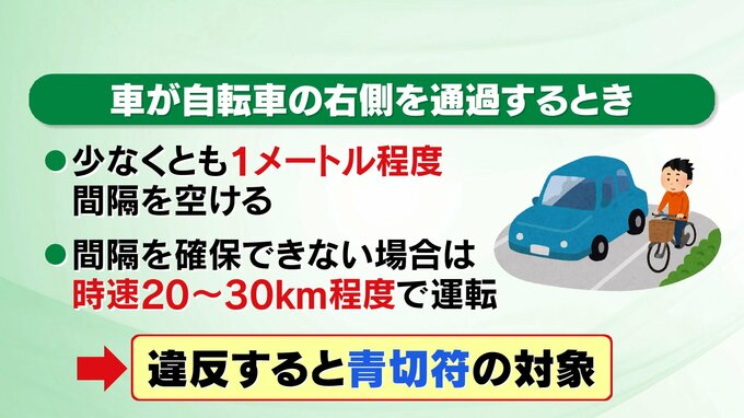 また、車のドライバーも、青切符の対象となる違反が追加されました。車が自転車の右側を通過するときは、少なくとも1メートル程度間隔を空けることが必要です。また、間隔を確保できない場合は、時速20キロから30キロ程度で運転しなくてはなりません。これに違反すると、青切符の対象となります。