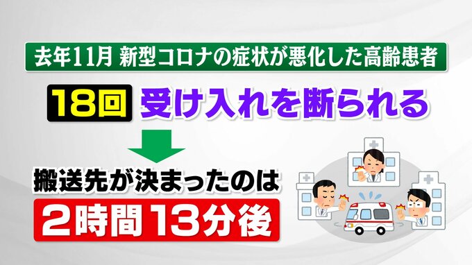 福島市消防本部では去年11月、症状が悪化した高齢患者の救急搬送で、搬送先を探していましたが、病院に18回断られ、搬送先が決まるまでに2時間13分かかったということです。
