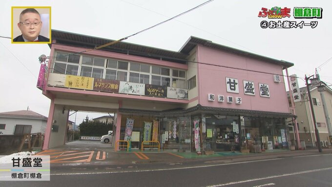 おいしいカラフルな四重奏があると聞いてやって来たのは、メインストリートにひときわ目立つこちらのピンクの建物。昭和14年創業の和洋菓子店「甘盛堂(かんせいどう)」です。