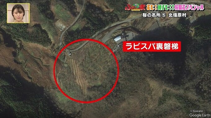 航空写真で見てみると、温泉施設「ラビスパ裏磐梯(うらばんだい)」の隣に規則正しく並ぶ木々が!