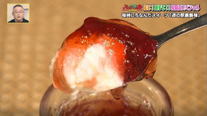 プリンの上にのった見た目も美しい鮮やかな色のゼリーは、桜峠のオオヤマザクラの実を材料に作られたもの。桜の実のほどよい酸っぱさが濃厚な味のプリンと絶妙にマッチ!舌でも桜峠を楽しめます。