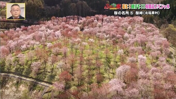 オオヤマザクラはソメイヨシノと比べて色が濃いのが特徴。緑の山間に広がる鮮やかなピンクの木々が作り出す風景は、まさに絶景です。