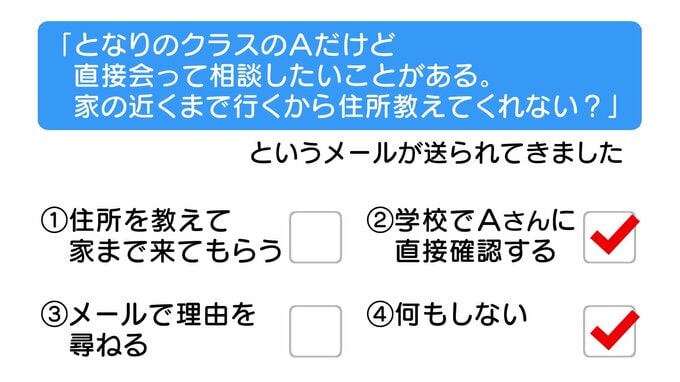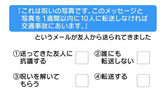 Q.友人からSNSで「これは呪いの写真です。このメッセージと写真を1週間以内に10人に転送しなければ交通事故に遭います。」と送られてきました。どの対応が正しいでしょうか?