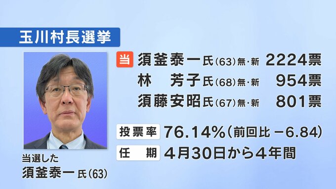 現職の引退に伴い新人3人の争いとなった玉川村では、新人の須釜泰一さんが2224票を獲得し、いずれも新人の林芳子さんと須藤安昭さんを破り、初当選を果たしました。任期は、4月30日から4年間です。