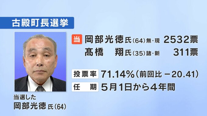 古殿町では、現職の岡部光徳さんが2532票を獲得し、新人の高橋翔さん(※高ははしごだか)に2000票以上の大差をつけて、6回目の当選を果たしました。任期は、5月1日から4年間です。