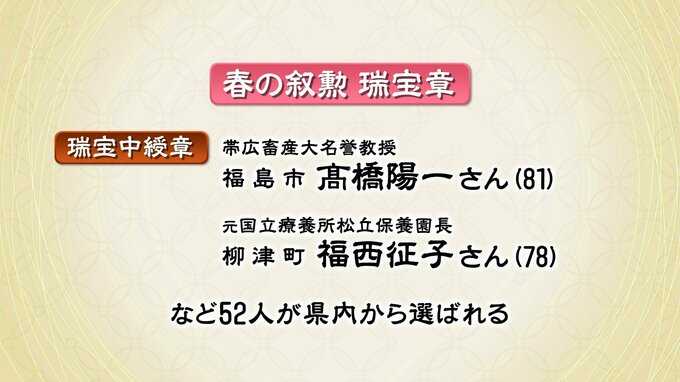 公共の事業に長年携わり、成績を挙げた人に贈られる瑞宝章には、中綬章に帯広畜産大学名誉教授で福島市の高橋陽一さん、国立療養所松丘保養園の元園長で柳津町の福西征子さんなど、52人が選ばれました。