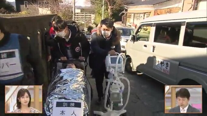 呼吸器とともに進むバギーに乗っているのは、笠間理恩さん(12)。心身に重い障害があり、自分で体を動かすことができません。冬の寒い日だったこともあり、災害用のブランケットを羽織り、スタッフが体調を観察しながら、訓練が続きます。