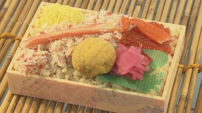 いわきの郷土料理「ウニの貝焼き」をのせた海鮮弁当。