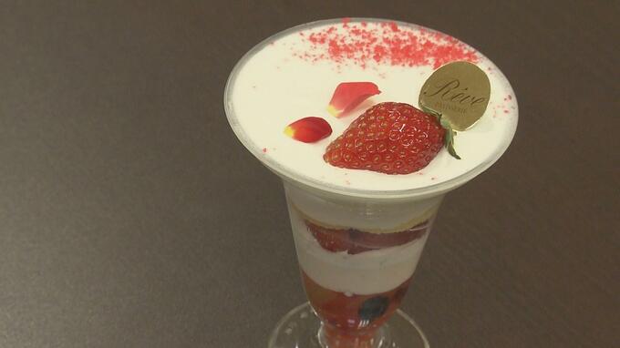 人気を集める鮫川村「レーヴ」のお持ち帰りができる色鮮やかなフルーツパフェには須賀川市のイチゴが使われています。