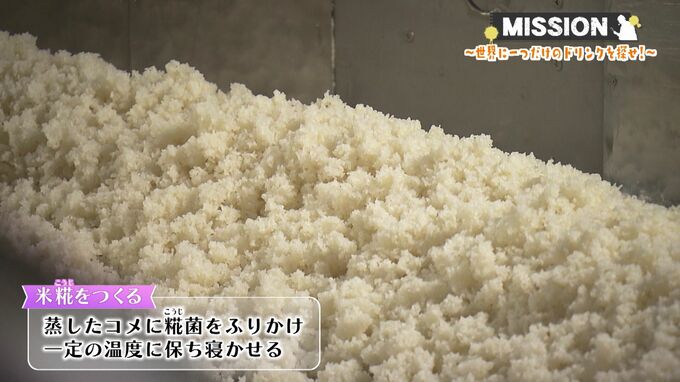 甘酒は、蒸したコメに糀菌をふりかけ、一定の温度に保ち、寝かせる。そして出来た米糀に水を加え、60℃の温度で6時間以上かけてじっくり発酵させる。すると糖化して、あま~い甘酒の出来上がり!