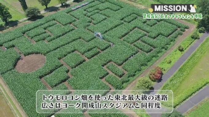 トウモロコシ巨大迷路は、広大なトウモロコシ畑を使った東北最大級の迷路。その広さはなんとヨーク開成山スタジアムと同じくらいだといいます。