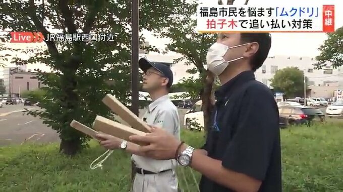 24日、福島市の職員が拍子木を打って、ある動物を追い払っていました。