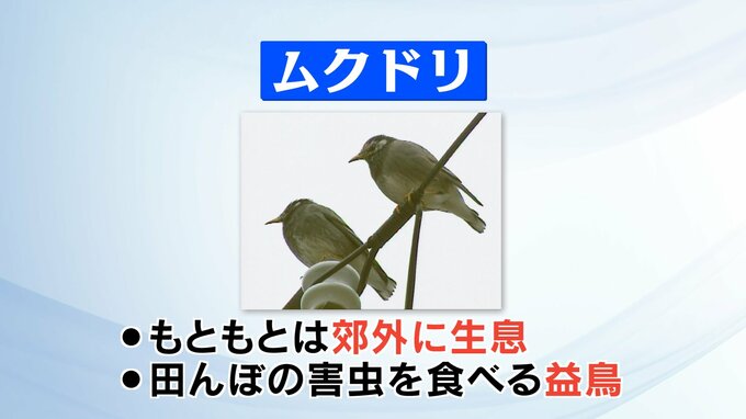 なぜムクドリは街なかに住みついたのか。それは天敵から逃れるためです。ムクドリはもともと市の郊外に生息していて、田んぼの害虫を食べる良い鳥・益鳥でした。