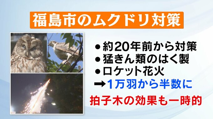 福島市ではおよそ20年、数々の対策を講じてきました。猛きん類のはく製を木の上に配置するほか、2020年には「大作戦」と名付けて、ロケット花火でムクドリを追い払っています。