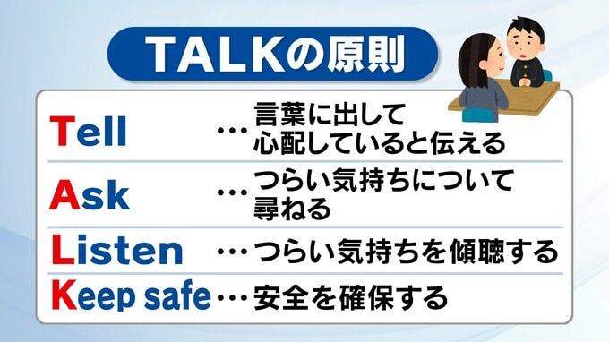 TALKの原則とは、T…Tell(心配していることを言葉にする)、A…Ask(つらい気持ちの背景にどんなことがあったのかを聞く)、L…Listen(つらい気持ちを傾聴する)、K…KeepSafe(安全の確保)です。