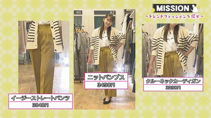 それではここで、トレンドファッションショー開幕です。颯爽と登場した小湊調査員。こちらはトレンドカラーのマスターカードのパンツと、黒色のニットパンプスの組み合わせがマッチした、トレンド感満載の1着。