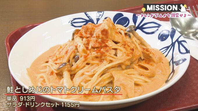 秋の新メニュー『鮭としめじのトマトクリームパスタ』がおすすめ。パスタと濃厚なトマトクリームソースが絡んで絶品です!