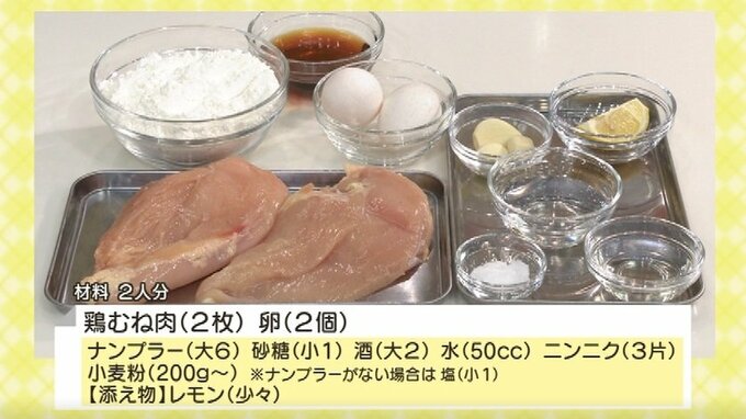 鶏むね肉(2枚)/卵(2個)ナンプラー(大6)/砂糖(小1)/酒(大2)/水(50cc)/ニンニク(3片)/小麦粉(200g)※ナンプラーがない場合は 塩(小1)/【添え物】・・・レモン(少々)