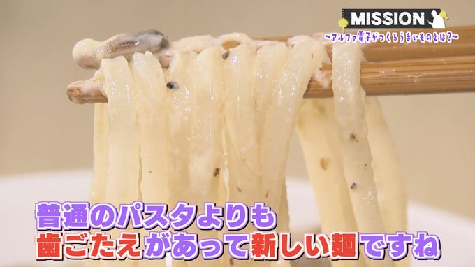 --佐藤調査員「もっちもちですね!普通のパスタよりも歯ごたえがあって、新しい麺ですね!美味しいです。『う米めん』にこのクリームソースがよく絡んで、しかもキノコの香りもうまく相まって、ぴったりです!」