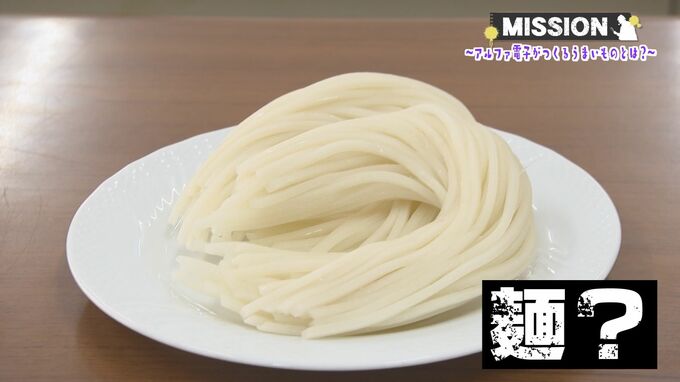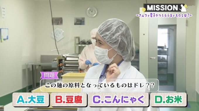 --樽川社長「玲奈調査員、ここで問題です!この麺の原料となっているものは次の4つのうちどれでしょう?A:大豆 B:豆腐 C:こんにゃく D:お米」