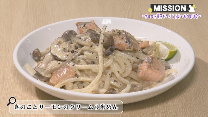 樽川社長に、これからの季節にぴったりの『う米めんレシピ』を作ってもらいました。『きのことサーモンのクリームう米めん』。おいしそう!