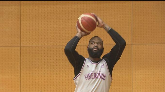 ホーム開幕戦を前に熱のこもった練習を行う選手たち。ボンズは、先週山形ワイヴァンズとの開幕戦に敗れたものの、2戦目は、チームの大黒柱・エチェニケ選手が24得点を奪う活躍を見せ、接戦をものにしました。
