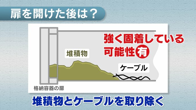 そして、扉が開いた後ですが、実は、貫通口には堆積物やケーブルがたまっている状態です。そのため、取り除く必要があるんですが、強くくっついて固まっている可能性があり、除去できない場合は別の方法でのデブリの取り出しを検討することになります。