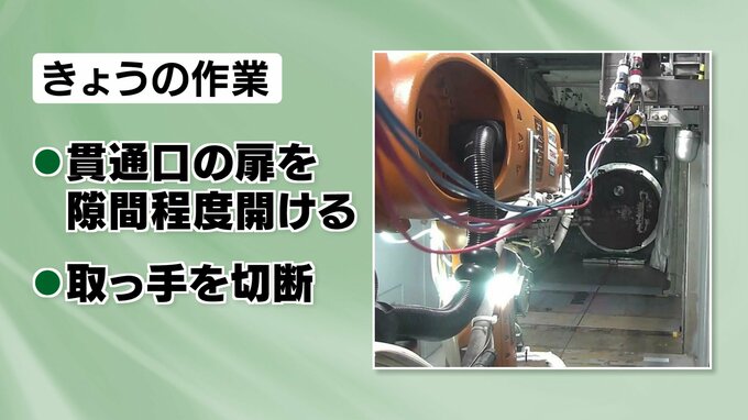 13日の作業では、専用の機械でこの貫通口の扉を開いて隙間をつくりました。今後は、扉が90度に開くように取っ手部分を取り除いていくということです。