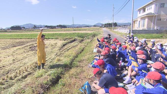 寺本卓也気象予報士が、福島県大玉村で地元の小学生に応援を受けながら稲刈りに挑戦。