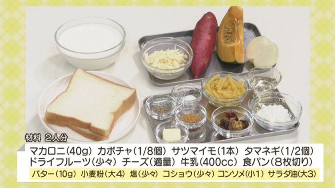 マカロニ(40g)/カボチャ(1/8個)/サツマイモ(1本)/タマネギ(1/2個)/ドライフルーツ(少々)/チーズ(適量)/牛乳(400cc)/食パン(8枚切り)/バター(10g)/小麦粉(大4)/塩(少々)/コショウ(少々)/コンソメ(小1)/サラダ油(大3)