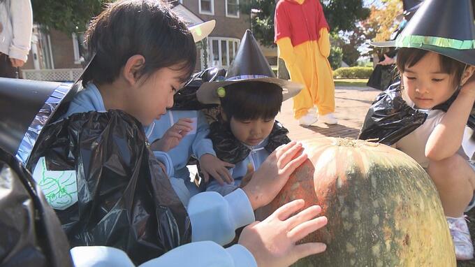 学生たちが仮装した園児を連れてキャンパス内を回っていると・・・早速、大きなカボチャを発見!キャンパス内には学生たちが作った「ジャック・オ・ランタン」がおよそ250個並べられていて、子どもたちは大興奮!