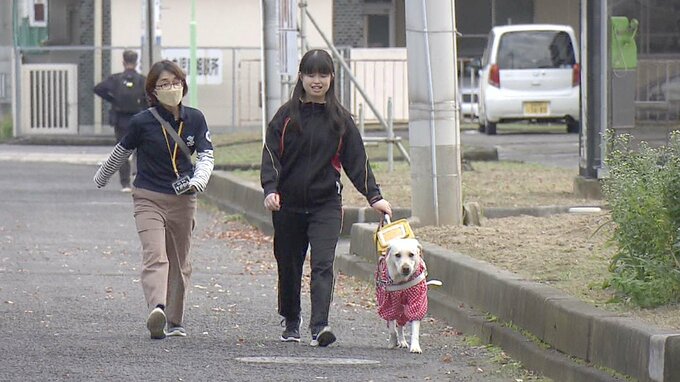 小湊愛巳アナウンサー「子どもたちは声をかけながら盲導犬と一緒に歩く練習をしています。」